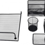 • Ensemble de bureau comprenant: 5 pièces de maille en métal noir:Corbeille poubelle, Pot à crayons, Trieur à 3 compartiments,Corbeille à courrier et Support bloc-note